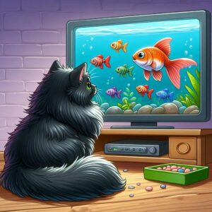 While we were watching part of the program featuring some brightly coloured fish being chased over a reef by sharks, Lucky came into the room. He was most intrigued by the images – though he didn’t know whether to be frightened of them or try to attack. Several times he crept into the room and sat there quite entranced with his big bushy tail twitching.
